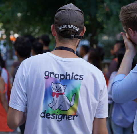 This is a t-shirt for graphic designers who are passionate about graphic design. Features an embroidered rainbow cat patch on the left chest and a colourful DTG printed back set in the finest font available.